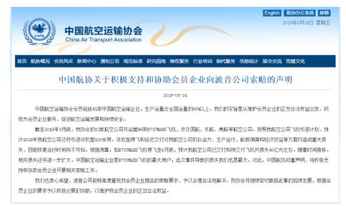 据悉,截至2019年3月底,协会的13家航空公司共运营96架B737MAX8飞机,涉及国航、东航、南航等航空公司。中国航空运输协会网站5月24日发布关于积极支持和协助会员企业向波音公司索赔的声明。衷心希望,波音公司能够高度重视协会会员企业提出的索赔要求,予以合理合法地解决。