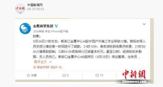 当晚23时14分,金鹰国际商贸集团(中国)有限公司通过官微通报,5月24日21时左右,新街口金鹰中心A座9F因户外施工作业导致火情。商场安保人员发现火情后第一时间进行了疏散,21时10分,南京消防到场展开救援,21时50分火情得到控制,22时41分现场明火已被基本扑灭。截至23时,经消防初步勘察,无人员伤亡。