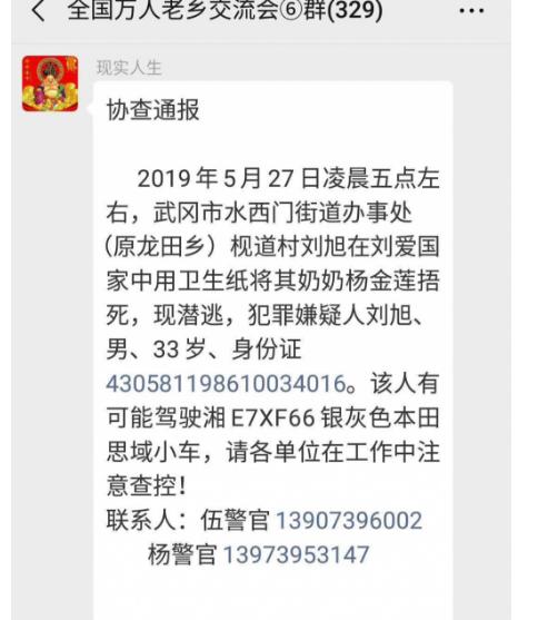 5月27日,邵阳武冈当地多个社交平台传播一份警方协查通报:5月27日凌晨五点左右,武冈市水西门街道办事处(原龙田乡)枧道村刘旭在刘爱国家中用卫生纸将其奶奶杨金莲捂死,现潜逃。