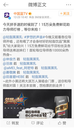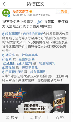 节目组专门与品牌联合作战这在以往的综艺中并不多见,足见节目组对黑黑乳的用心。黑黑乳为了答谢各位粉丝的厚爱,自然大方出手。先是替粉丝送花表白五大导师买单,有爱互动吸引各家明星粉丝纷纷捧场。送鲜花活动更联合爱奇艺、中国蓝同步助力,壕送15万朵鲜花一天内全部领空让人不禁感叹:厉害了,我的黑黑乳!