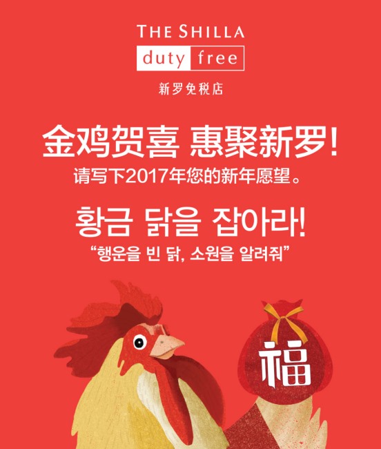 根据中国农历鸡年的传统,届时新罗免税首尔店将以”鸡”为主题进行装饰,以焕然一新的面貌迎接来自世界各地的客人。1月10日至2月27日, 在新罗免税店首尔店屋顶花园, 取下幸运谚语, 并写下心愿参与活动, 即有机会获得纯金鸡. 新罗网上免税店“鸡年幸运大爆发,金蛋送翻天”活动正在热力进行中,鸡年运势抢先看,50万元金蛋砸出“金”喜,百分百中奖机会。