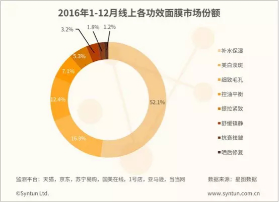 《2016年中国面膜微商行业市场研究报告》的数据显示,微商面膜市场渗透率为22.8%,也就是说微商面膜市场还有极大的发展空间。从功效来说,目前微商面膜用户对面膜功效的需求仍然主要集中于补水保湿,份额超过50%,从类型来说,线上售出最多的仍旧是贴片式面膜,其份额年均保持在7成左右。所以目前来看,贴片式的补水面膜无疑是最热销的。