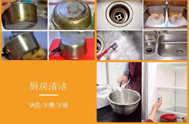 在厨房,小苏打更是表现神勇。如果不小心把锅烧焦了,就在锅中倒8分满的清水和1小匙的小苏打,中火煮沸后关火,让锅里的水慢慢冷却再倒掉,然后用海绵轻轻刷洗,很快就可以恢复如新啦;水槽用久了,就会感觉灰蒙蒙的,用牙刷沾上小苏打来刷,便能去除台面的污垢,恢复原晶亮啦。