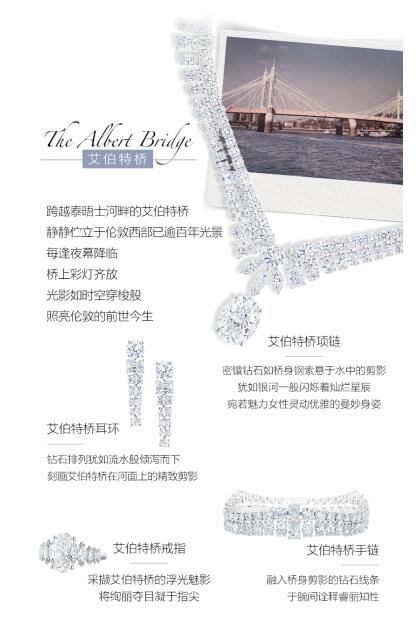 始建于1873年的艾伯特桥,静伫在泰晤士河上,桥体本身轻盈的线条给予了戴比尔斯艾伯特桥系列曼妙的造型,戴比尔斯将精心挑选的椭圆形,马眼形,祖母绿形以及圆形明亮形的钻石汇聚于此,打造出这一极富流线型感觉的系列。其中,艾伯特桥项链的外观上,除了被密钻包裹之外,还镶有一颗重达10.38克拉的E级椭圆形切割钻石,璀璨夺目极富美感。