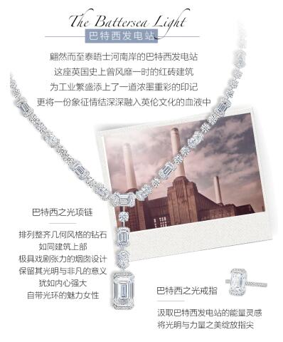 在巴特西之光系列的钻石珠宝首饰上,你便能从戴比尔斯精湛的钻石打造技艺上看到它们。从一系列规则的切割到一颗颗钻石的镶嵌,美轮美奂的巴特西还原了这里的历史。