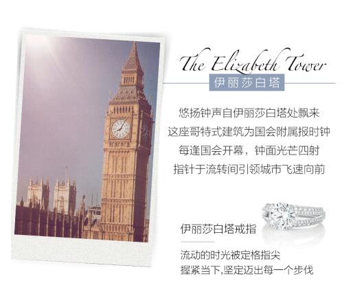 说到英国,一定会第一时间想到大本钟,想到伊丽莎白塔。这一经典元素也被使用在戴比尔斯钻石珠宝首饰的打造之上,从伊丽莎白塔系列项链到戒指,你随处可见英伦风情元素在这里绽放。