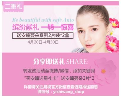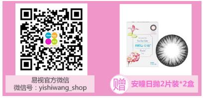 镜片核心和表面的特性都得以最优化,打造出名副其实的“安心”美瞳。二重礼:关注易视官微:yishiwang_shop 查看最新推送消息,或菜单栏“安瞳美妆大赛”转发该活动,添加关键词“买安瞳送星礼卡”即送安瞳蔓朵日抛2片装*2盒。