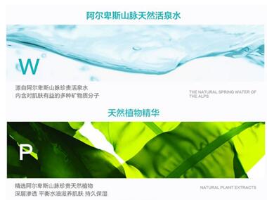活泉水采自阿尔卑斯山脉。因地处温带和亚热带纬度之间,阿尔卑斯的活泉水含有多种对肌肤有益的矿物质分子,活泉水的矿物质分子能使肌肤保持弹性不易发油,深层渗透肌肤内部,使肌肤持久保湿。而阿尔卑斯天然植物对人体肌肤也有保湿作用,能深层渗透人体肌肤,平衡水油、滋养皮肤,持续保湿效果明显,对肌肤还能起到保护作用。
