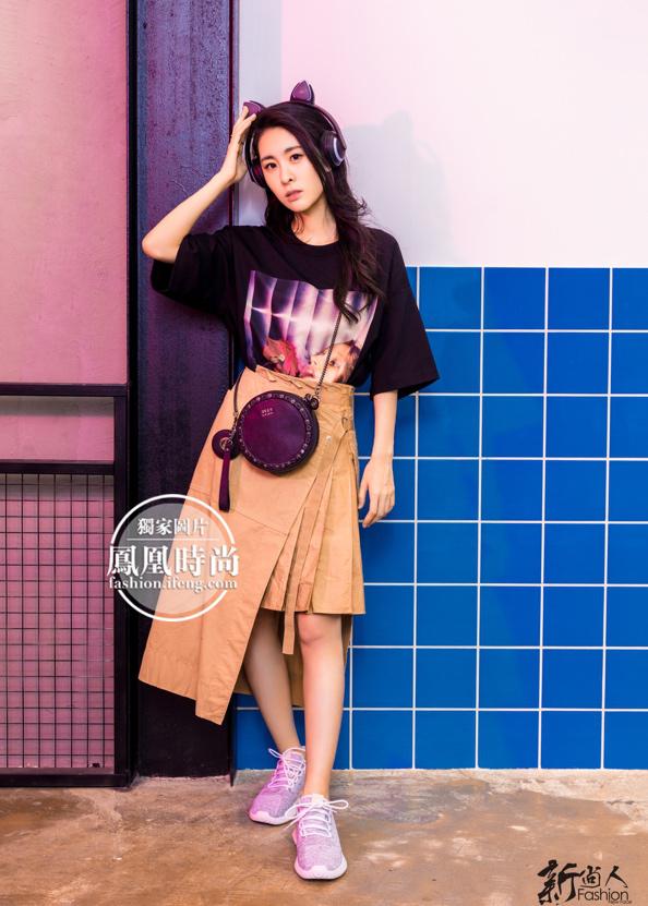 一件宽松版印质图案T恤搭配不规则下摆工装裙的造型,看似简单随意却也彰显出细节的小巧思。脚踩一双复古慢跑鞋强调出休闲运动感,与此同时,头上佩戴的猫耳型设计炫彩发光耳机又将前沿科技感融入其中,整体造型俏皮可爱又不失时尚气息。