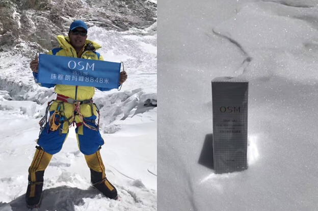(图为潘正胜与欧诗漫产品登上珠穆朗玛峰)