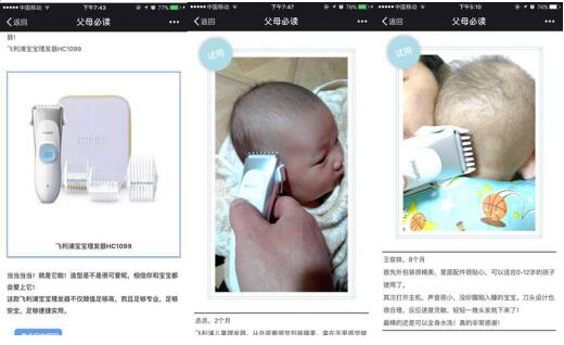 专业母婴科普杂志《父母必读》从科学育儿的角度诠释了一台高品质、安全、方便的宝宝理发器对于呵护宝宝头皮健康的重要性,并证言飞利浦宝宝理发器在其专业性、安全性和实用便捷性上的优势。同时,飞利浦携手父母必读在微信平台发起试用活动,提供了70台飞利浦宝宝理发器HC1099试用名额,活动一经推出便收到了超过500位爸妈的踊跃申请。获得免费试用名额的幸运爸妈们在试用后也第一时间分享了试用体验,传授理发诀窍,对飞利浦宝宝理发器的专业品质和实用设计赞不绝口。