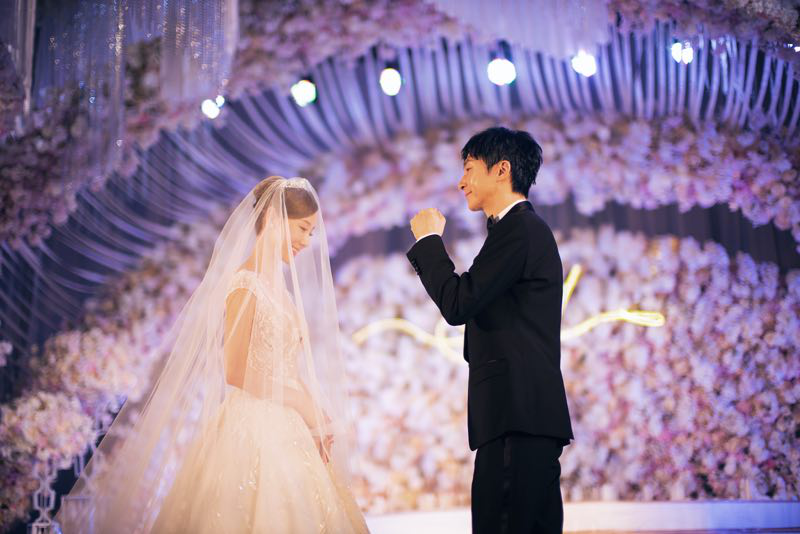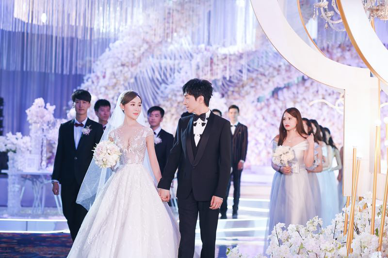 整场婚礼用了上千朵香槟玫瑰蝴蝶兰和绣球点缀成童话故事里的花海,象征着这对新人纯洁的爱情,一对新人置身其中,在灯饰的映照下如同“王子与公主”般唯美浪漫,尤其是苏可望向娇妻的眼神也同样是充满了爱意与宠溺。