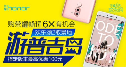 荣耀618欢乐购期间,荣耀V9尊享版优惠100元、荣耀8最高省300元、荣耀V8最高优惠200元、荣耀Magic全网通版还有豪礼相送、荣耀NOTE8直降200元。同时,千元双摄担当荣耀畅玩6X最高优惠100元,更有机会赢取普吉岛旅游大奖。