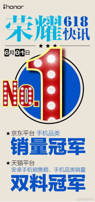 6月2日凌晨,京东官方公布了2017年京东618开幕首日手机品类(6月1日)竞速榜单排名,其中荣耀手机勇夺京东手机品类销量冠军、天猫平台安卓手机销售额+手机品类销售量双料冠军。荣耀在618开幕第一天,就凭借一贯累积的消费者口碑及品质驱动的消费者购买力印证了自己的实力,为2017年618年中大促创下了良好的开端。