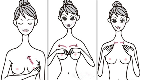 1、用右手将左胸向斜上方托起,用右手将左胸从下方外侧托起并向内上方使力。