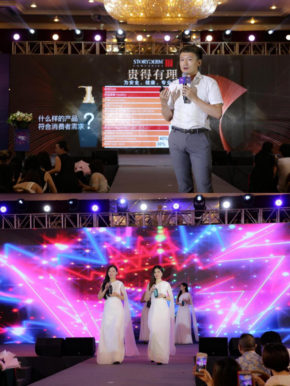 青葱新媒体汕头新零售峰会现场,黎总为大家详细的讲解了STORYDERM汀洗护系列的优质配方,现场还有美女T台秀。代理手持STORYDERM汀大黑瓶和大绿瓶在T台上走秀,秀发飞扬,神彩奕奕。汀大黑瓶及汀大绿瓶也在台上展示了它的风彩,时尚的包装、完美的造型,汀大黑瓶及汀大绿瓶成了全场的焦点。