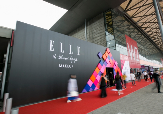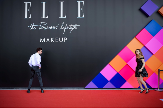 ELLE MAKEUP彩妆甫一亮相,便吸引众多目光:外场高4.8米的展板,简洁大气,尽显ELLE品牌张力!同时,右侧彩色的方形色块,堆砌成菱形的卢浮宫外形,很好地表现了彩妆品牌的色彩和活力!