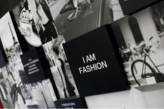 场馆内部,设计形式内敛又有态度,黑色主调,与白色的LOGO搭配,品牌墙那句:“I am fashion”、随处可见的品牌官方图片,这一切,散发着浓浓的异国情调与品牌的任性!
