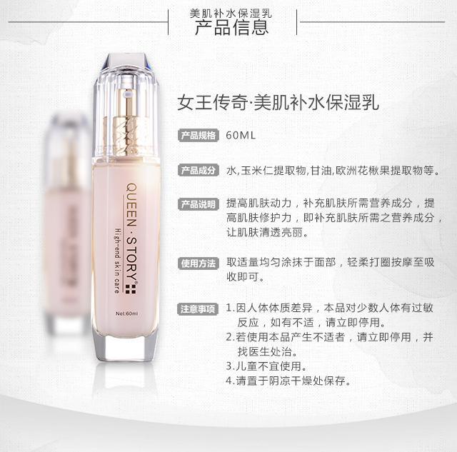 女王传奇·美肌补水保湿乳能够提高肌肤动力,补充肌肤所需营养成分,提高肌肤修护力,即补充肌肤所需之营养成分,让肌肤清透亮丽。