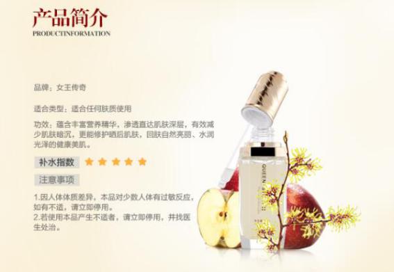 女王传奇·美肌补水精华原液蕴含丰富营养精华,渗透直达肌肤深层,有效减少肌肤暗沉,更能修护晒后肌肤,肌肤自然亮丽、水润光泽的健康美肌。神经酰胺及透明质酸是天然保湿因子,能建立和维持肌肤指质屏障,填补清洁过度所造成的角质流失缝隙,让您的肌肤持久润滑,青春常驻。富含苹果果实细胞抗氧化成分,透肌直达表皮基底层,使肌肤焕然一新。初次使用,肌肤既感柔滑、细腻、光泽,使用数周后,肌肤得到极大改善。