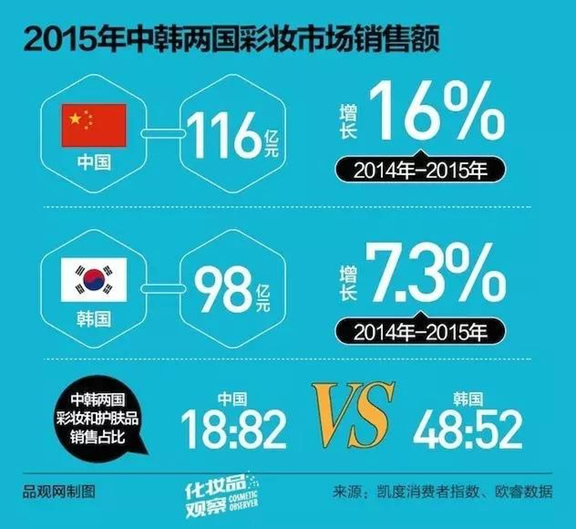中国彩妆市场增速远超韩国,2015年中国彩妆市场份额达到116亿元,相较于2014年同比实现了16%的增长。2015年,韩国彩妆市场销售额17894.71亿韩元(折合人民币超过98亿元),相较于2014年增长了7.3%。中国彩妆市场增长速度高于韩国彩妆增长速度的两倍。