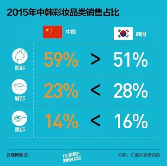 从细分品类的使用情况也可窥一二。在彩妆品类占比中,中国2015年彩妆市场的销售额占比最大的依次是脸部产品59%、唇部产品23%、眼部产品14%。其中BB霜在脸部产品中占比最高,为28%。韩国2015年销量占比最大的分别为脸部产品51%、唇部产品28%、眼部产品16%。