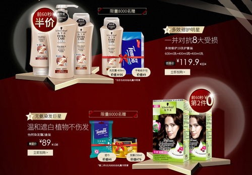 据了解,此次9.9促销活动中,店方还推出了“0元秒杀”活动,施华蔻多效修护19电商套装套装和施华蔻怡然染发霜2盒装聚划算活动,前30秒付款的买家第二件0元。购买多效修护19电商套装还可以追加送多效修护19洗发露400ml(限量8000份),先到先得。 购买施华蔻怡然染发剂2盒装,追送多效修护19系列快捷套装(限量8000份)