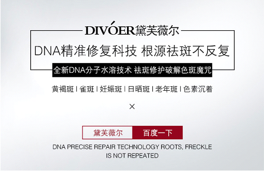 黛芙薇尔(Divoer)全新的DNA水溶分子技术,彻底颠覆了传统观念中的皮肤外在保养机制,从皮肤深层着手,其所含的多种祛斑因子活性成分吸收性强、渗透性强,能够穿透三层皮肤组织,渗透表皮层、基底层,直击"斑"源吸除黑色素,从最底层推进净白动力,令皮肤基底层中聚合在一起的黑色素细胞团彻底崩解分化,真正实现从根源上祛斑,层层淡化潜在色斑、肌肤表面的微小色斑、雀斑、黄褐斑、日晒斑、辐射斑等斑点问题,直至消失,使肌肤达到通透白皙无暇的完美效果。是被大家认可的最有效的祛斑产品。