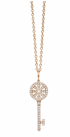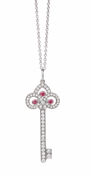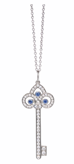 这次独家呈献的四款独特Tiffany Keys吊坠﹕铂金镶蓝宝石及钻石鸢尾花钥匙吊坠、铂金镶樱花粉宝石及钻石鸢尾花钥匙吊坠、铂金镶钻花瓣钥匙吊坠以及18K玫瑰金镶钻花瓣钥匙吊坠。这四款全新Tiffany Keys吊坠光彩照人,是乐观与希望的象征并流露着这系列设计的沿革。吊坠推出于佳节时分,是优雅永恒的赠礼之选,可代代相传且令人珍而重之。