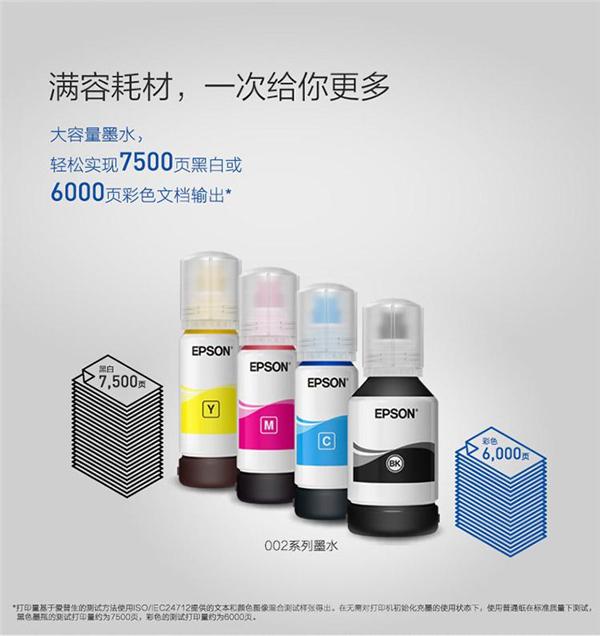 *1 打印量基于爱普生的测试方法使用ISO/IEC24712提供的文本和颜色图像混合测试样张得出。在无需对打印机初始化充墨的使用状态下,使用普通纸在标准质量下测试,黑色墨瓶的测试打印量约为7500页,彩色的测试打印量约为6000页。