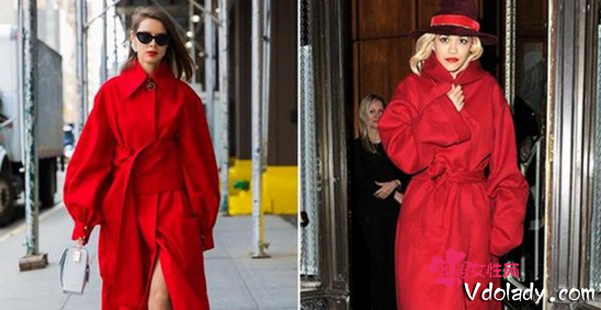 和系扣的相比,腰带款式的红色大衣更能凸显女人味和高级感,一根腰带就将身材和气质完全绑出来了,拉高腰线,营造好比例,秒变大长腿。