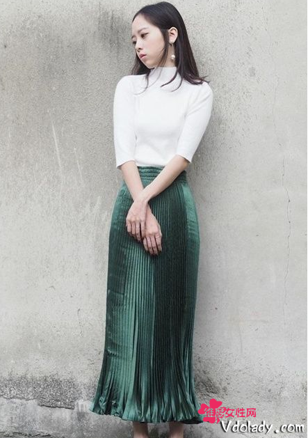 穿金属色百褶裙的时候,最先发愁的就是陪什么颜色上衣好看,冬季百褶裙,特别是丝绒的百褶裙,比较流行的颜色就是绿色、粉色和金属色,上衣搭配根据颜色和质感的区别,风格也不一样。