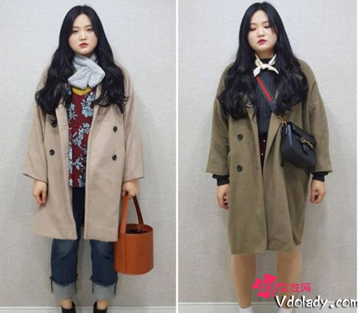 杏色和军绿色的大衣,内搭一点有颜色的单品更时髦,像碎花和波点这样很小女生的元素,胖MM穿起来更可爱呢。