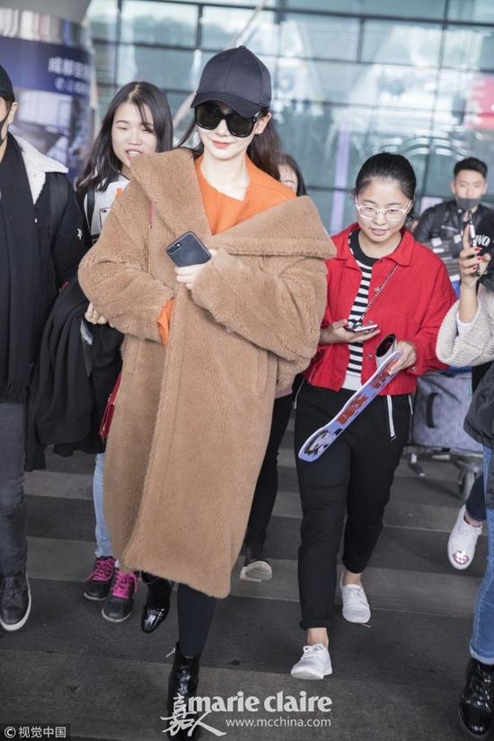 看来身为时髦精的戚薇也禁不住毛毛大衣的诱惑,她戴黑色棒球帽和墨镜,身穿Max Mara驼色羊羔毛大衣,内搭橙色毛衣,下身穿打底袜,脚踩漆皮粗跟踝靴,保暖又显时髦。