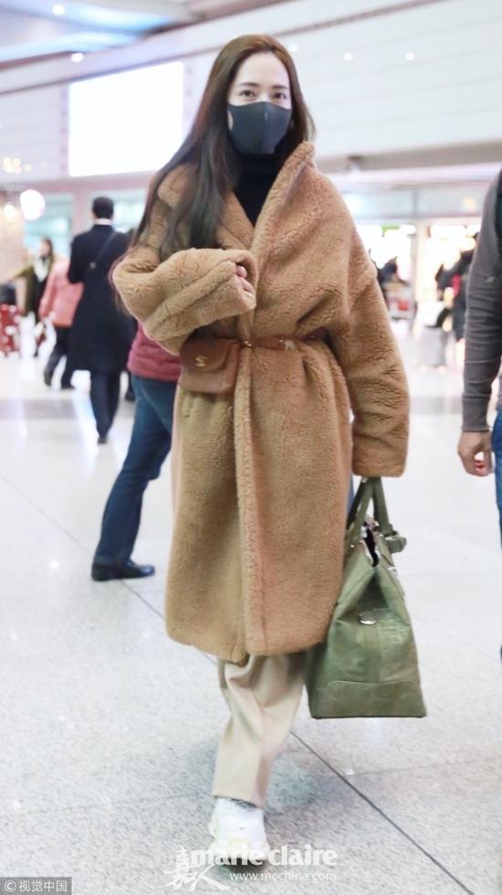俏丽时髦的郭碧婷灰色口罩遮面,身穿Max Mara驼色羊羔毛大衣外套,内搭黑色上衣,腰系黄棕色Chanel腰包,手拎军绿色大包,下穿卡其色阔腿裤,脚穿Balenciaga系带白色老爹鞋,长发飘飘,可爱又迷人。