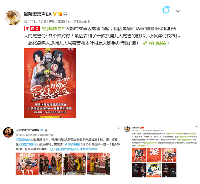 当越来越多的粉丝们参与进来后,3月12日乔丹发布天猫欢聚日海报,同时邀请众多kol一同发声,火影粉丝圈官博、cos大触、动漫类目大号同时在各大社交平台联合声援。3月13日—3月15日#天猫欢聚日#乔丹体育&火影忍者联名T恤在乔丹天猫官方旗舰店热血首发!
