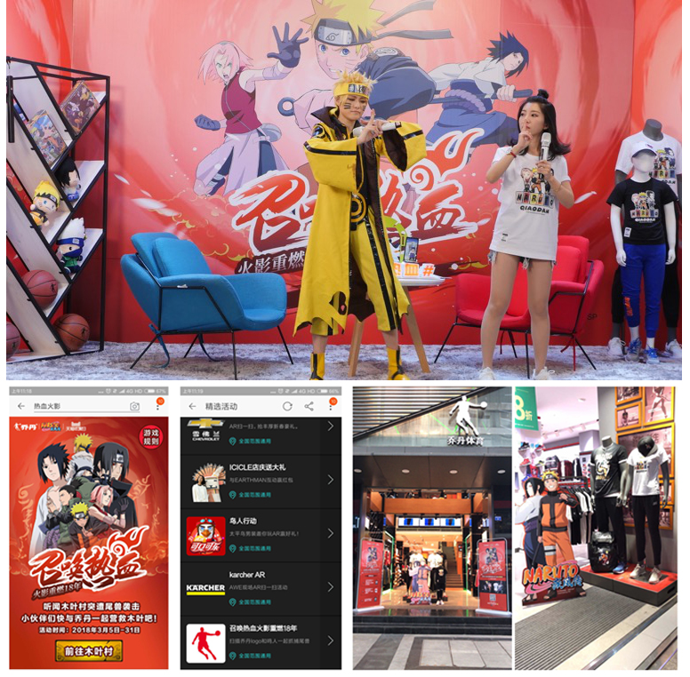 与此同时,为了满足广大粉丝对乔丹和火影联名活动的期待,乔丹体育全国线下旗舰店精心设置成火影忍者主题店供粉丝留影互动。其它未能到门店的用户还可通过AR扫乔丹logo的方式或搜索淘宝穹顶词的方式参与《鸣人封印九大尾兽》小游戏,并获取优惠券。真正实现了线上和线下的联动,让粉丝们再度回想起当年一起追火影的青春岁月。