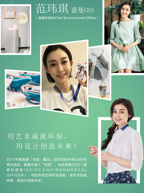 2018年,茵曼迈入十周年,将携手何香凝艺术设计学院、《城市画报》、飞蚂蚁、心田庄园、掰掇创始人Kary老师,为「衣起重生」旧衣回收项目注入公益新势力,也希望向公众传递“环保可持续发展”的茵曼品牌核心理念。