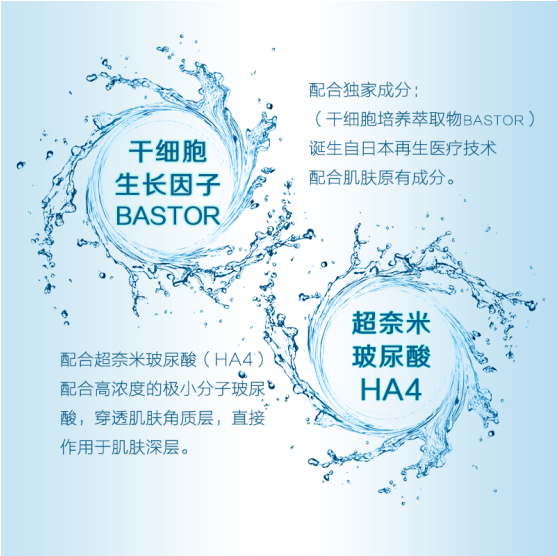 在干细胞培养萃取精华和超奈米玻尿酸的双重作用下,使肌肤由内之外恢复弹性紧致,重现滋润透亮,焕发年轻光彩。