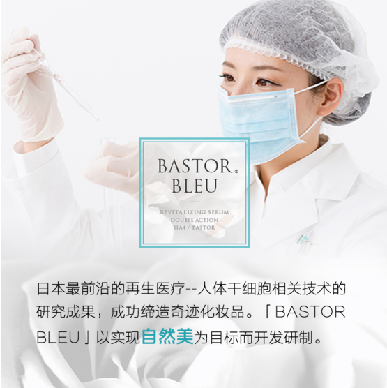 Bastor Bleu,是以实现肌肤“自然美”为研发目标而成立的品牌。在日本最前沿的再生医疗及干细胞相关技术的研究背景下,成功研发出结合了“干细胞培养萃取精华Bastor”和“极细纳米玻尿酸HA4”成分的崭新美容精华液,为肌肤源源不断地注入独一无二的珍贵能量,还原自然美肌!