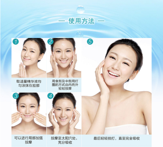 02 把美容精华液均匀涂抹于脸上,轻按促进吸收