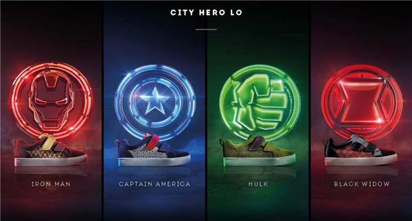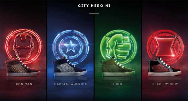 钢铁侠是极具人气的漫威英雄之一,他的强大动力是复仇者联盟中一股不容忽视的力量。设计上通过金属色细节搭配红色翻毛皮材质突显钢铁侠的特点,在靴款CITYHEROHI和板鞋CITYHEROLO两款的鞋身上还印有钢铁侠头像,进一步提高了辨识度。
