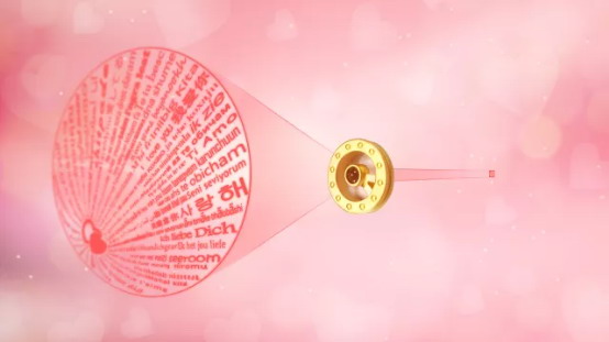 【全世界的爱】采用3D立体硬金工艺、沙面处理,精雕细琢、深邃内敛。采用先进的纳米微雕技术,在仅有5毫米直径的空间镌刻一百种语言的“我爱你”,更加放大了“我爱你”的情深意重。