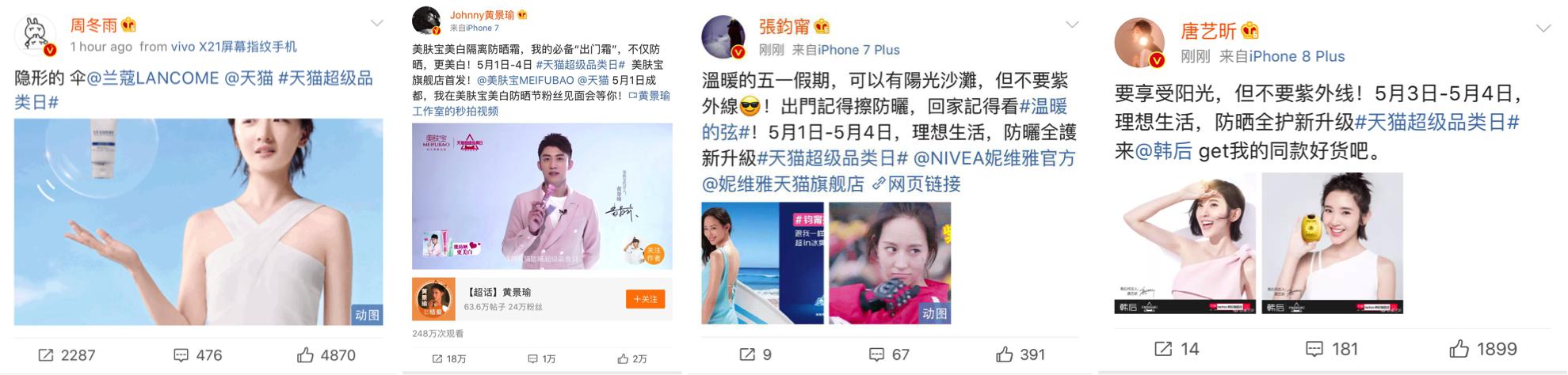 据了解,本次天猫超级品类日防晒专场在线上联手多位明星,包括周冬雨、张钧甯、唐艺昕、阚清子、吴昕、黄景瑜、SING组合、邱赫南等,纷纷在自家微博下分享防晒护理心得,揭秘她们肤白貌美的秘密。在分享心得的同时,明星们也不忘为粉丝“种草”,多个明星同款的防晒产品得到集中发声,在天猫超级品类日的话题标签下,瞬间收获上亿阅读量,数十万评论和转发。