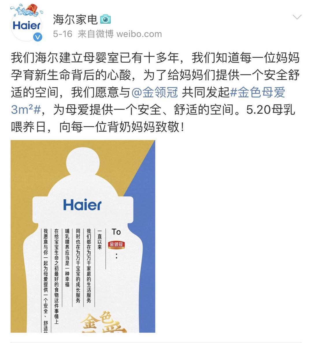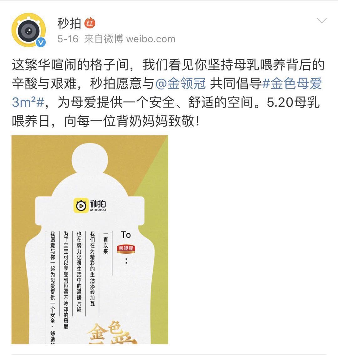 16年来,金领冠坚持母乳研究,因此他们更加了解哺乳期女性群体的状态,深知她们的不容易,值此今年5.20母乳喂养日之际,金领冠携手百家企业发起“金色母爱3㎡”倡导,本次活动受到包括京东、秒拍、海尔、百雀羚等百家企业的支持。希望通过大家的共同呼吁,让更多企业自愿为妈妈们提供一个爱的空间。