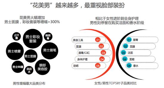 对美的追求也从脸部拓展到全身。全球购数据显示,足部护理,胸部护理等身体护肤类需求正在爆发,销售额增幅超过55%。越来越多的男士也开始为面子工程买单,男士彩妆和面膜的销量增幅高达300%。唇膏、香水、粉底成为最受男士青睐的彩妆Top3。“说上海男人最精致一点不为过,他们每五人中就有一人买过粉底”。