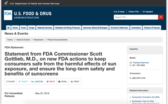 这则引起国内外媒体争相报道的公告来自于Scott Gottlieb博士,其主要针对美国现在皮肤癌正在处于逐年上涨的情况下,美国医疗界和政府部门希望通过各种努力,来帮助人们解决皮肤癌问题。除了设立纪念日、推动防晒技术创新政策举措以外,FDA今年还将通过三大手段来完善夏季防晒战略框架,其中的一点便是确保消费者使用的产品能够提供他们宣传的疗效。
