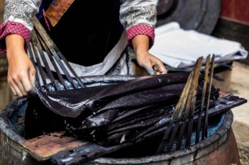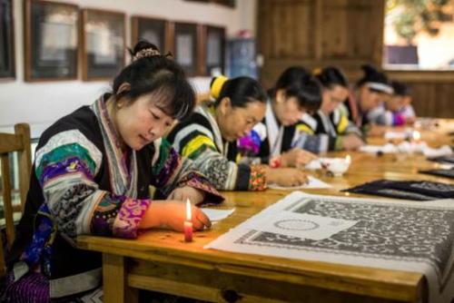 蜡染有着两千年历史,是古代三大染色技艺之一。绣娘们经过织布、画蜡、染色、退蜡、晾晒等繁杂步骤,在一小方麻布上聚合出万物之美。流畅而精细的线条,充满寓意的花纹和图腾,传承着苗族独特的文化。