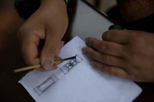 这款包包也是蜡染手工制作,绣娘执蜡笔勾勒,蝴蝶纹理浑然天成,
