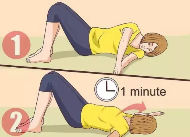 平躺后弯曲双腿,保持脚底平放在地板上。同时双臂伸呈T字形,记得肩膀和手臂要一直保证在同一水平线停留一分钟。